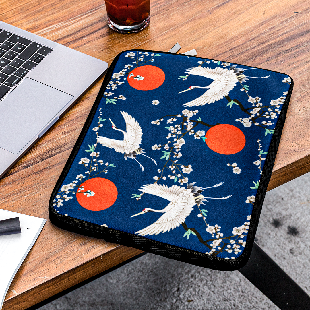 Protect your laptop with our elegant Cranes And Blossoms Laptop Sleeve. Made from durable materials, it features a beautiful design of cranes and blossoms, adding style to its functionality. Keep your device safe from scratches and bumps while showcasing your unique taste.